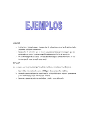 La World Wide Web es uno de los servicios web más utilizados, que funciona bajo un modelo cliente-servidor donde los clientes solicitan datos al servidor a través del protocolo HTTP. Las intranets y extranets permiten compartir información dentro y fuera de una empresa o institución de manera similar a la web, pero con un alcance más limitado.