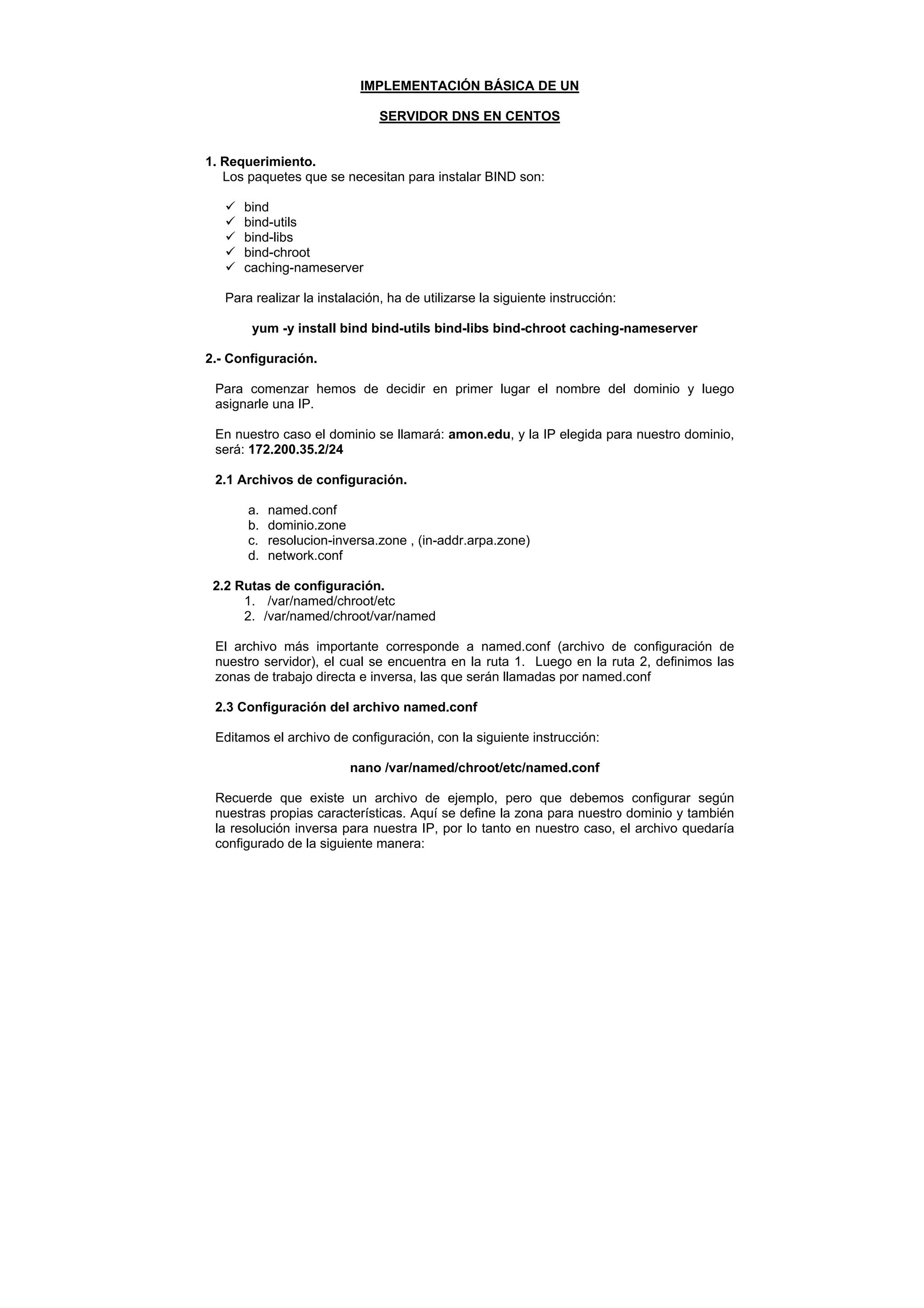 Este documento describe los pasos para implementar un servidor DNS básico en CentOS. Incluye instalar los paquetes necesarios como BIND, configurar el archivo named.conf para definir las zonas directa e inversa, editar los archivos de zona para agregar registros como A, NS y CNAME, y finalmente iniciar el servicio named.
