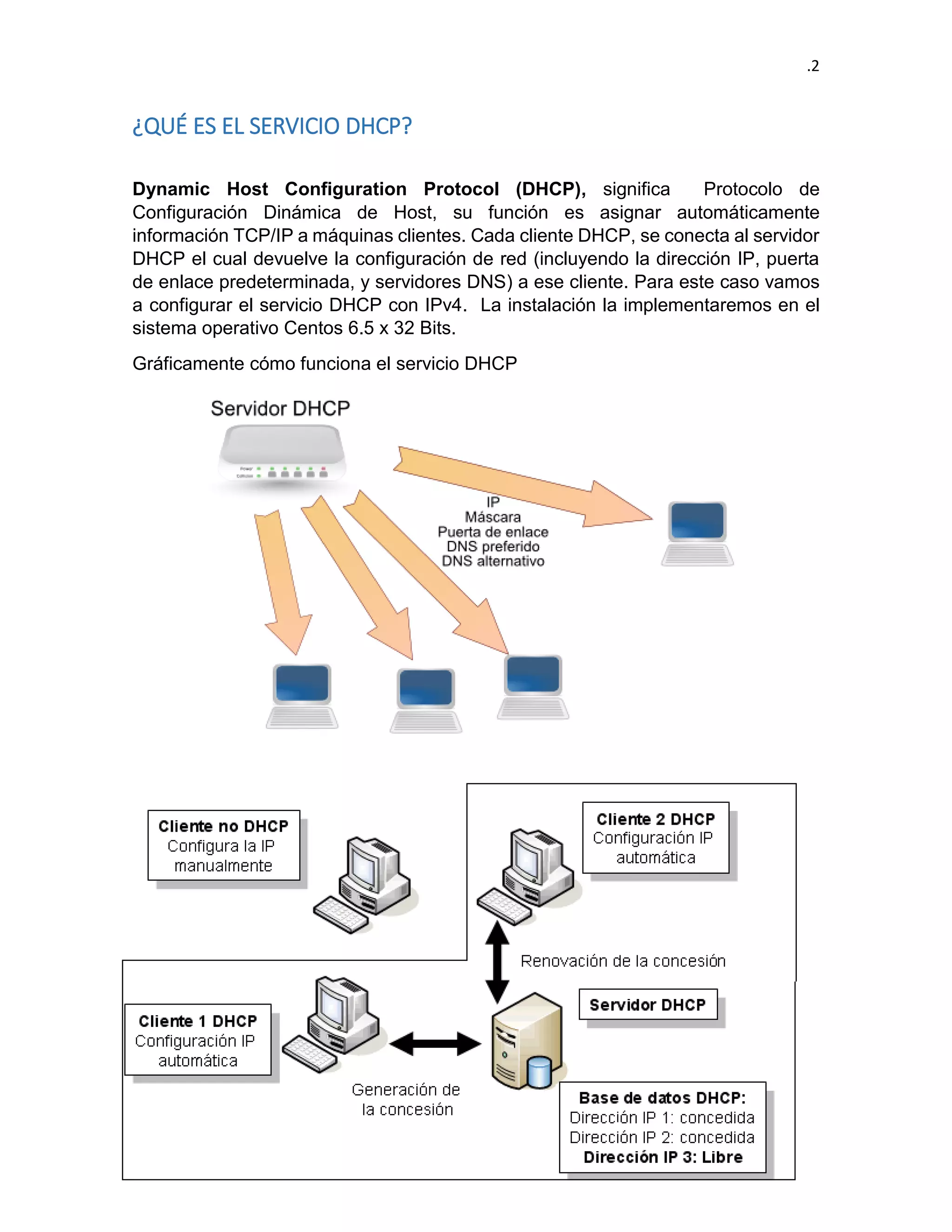 Este documento describe cómo configurar un servidor DHCP en CentOS 6.5 para asignar direcciones IP dinámicamente a clientes en la red local. Explica los pasos para instalar y configurar el servicio DHCP, incluyendo la edición de archivos de configuración, el establecimiento de un pool de direcciones IP, y la prueba del servicio DHCP con un cliente Windows 7. También aborda la desactivación de SELinux para permitir la ejecución del servicio DHCP.