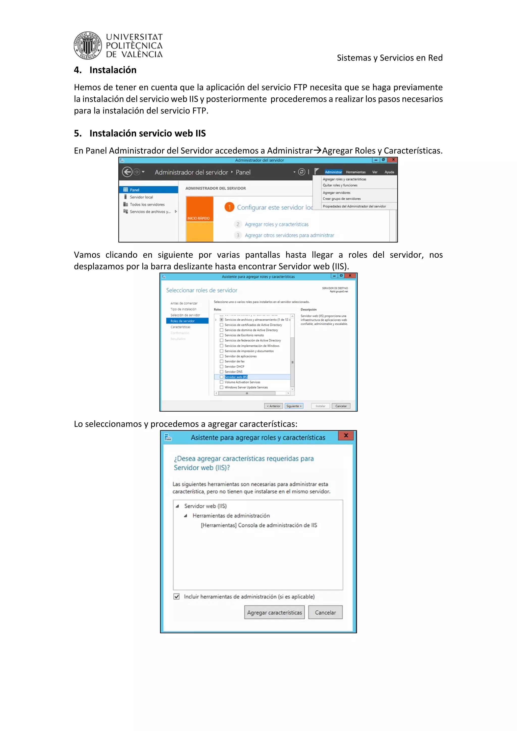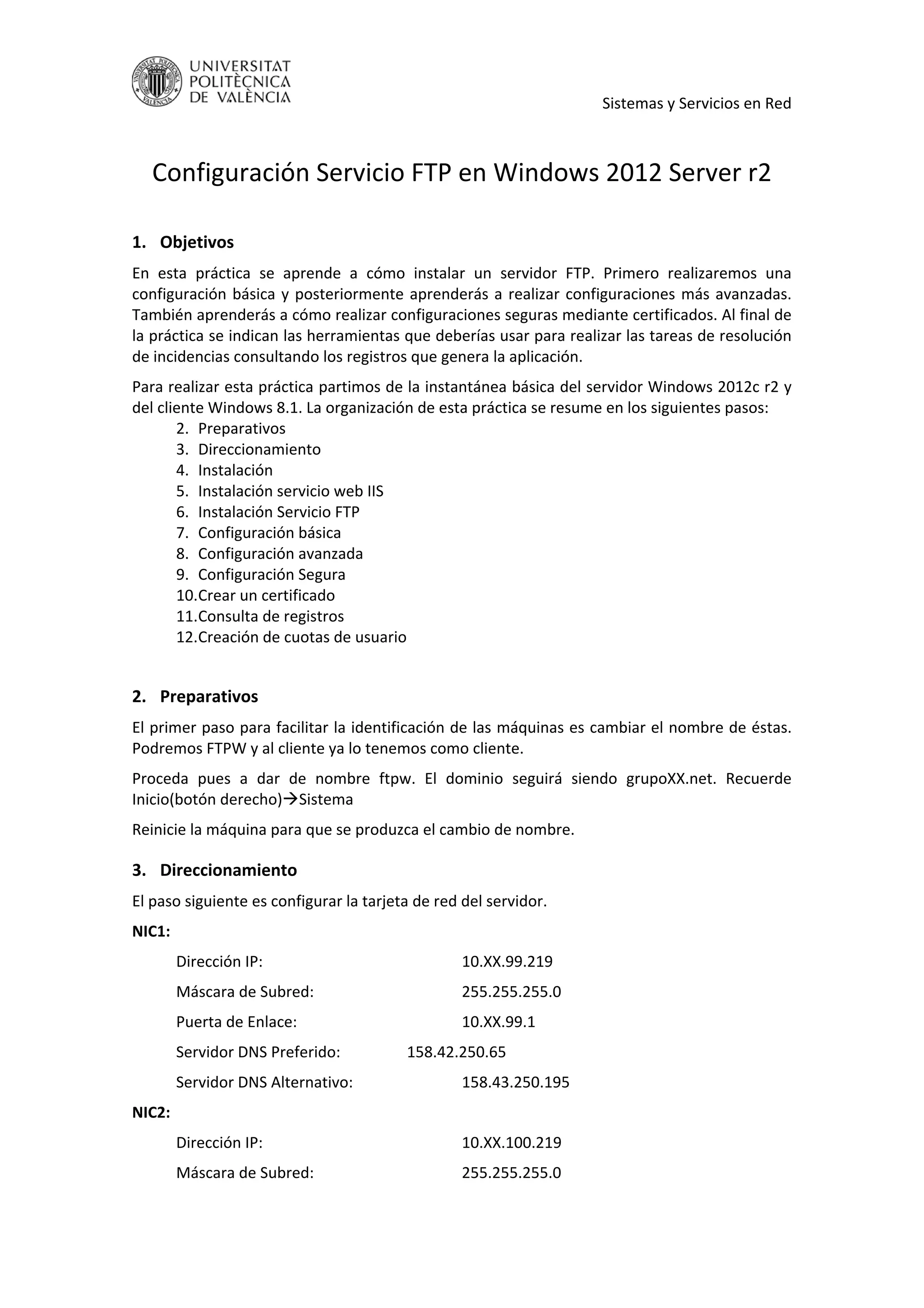 Este documento describe los pasos para configurar un servicio FTP en Windows 2012 Server r2, incluyendo la instalación e IIS y FTP, configuración básica y avanzada, y comprobación del funcionamiento a través de una conexión FTP desde un cliente. Primero se instala IIS, luego FTP, y se realiza una configuración básica del sitio FTP, autenticación de usuarios y permisos. Finalmente, se comprueba que se puede acceder al servidor FTP de forma anónima y autenticada desde un cliente a través de FTP.