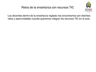 Este documento describe los retos de integrar recursos TIC en la enseñanza, incluyendo la diversificación de soportes digitales y la necesidad de que los recursos sean multiplataforma. Explica cómo el servidor Moodle en un centro educativo puede ayudar a enfrentar estos retos al permitir la administración y monitoreo de recursos TIC de forma integrada. Detalla las ventajas de tener un servidor Moodle propio basado en software libre, incluyendo mejor rendimiento, seguridad y capacidad de adaptación a las necesidades