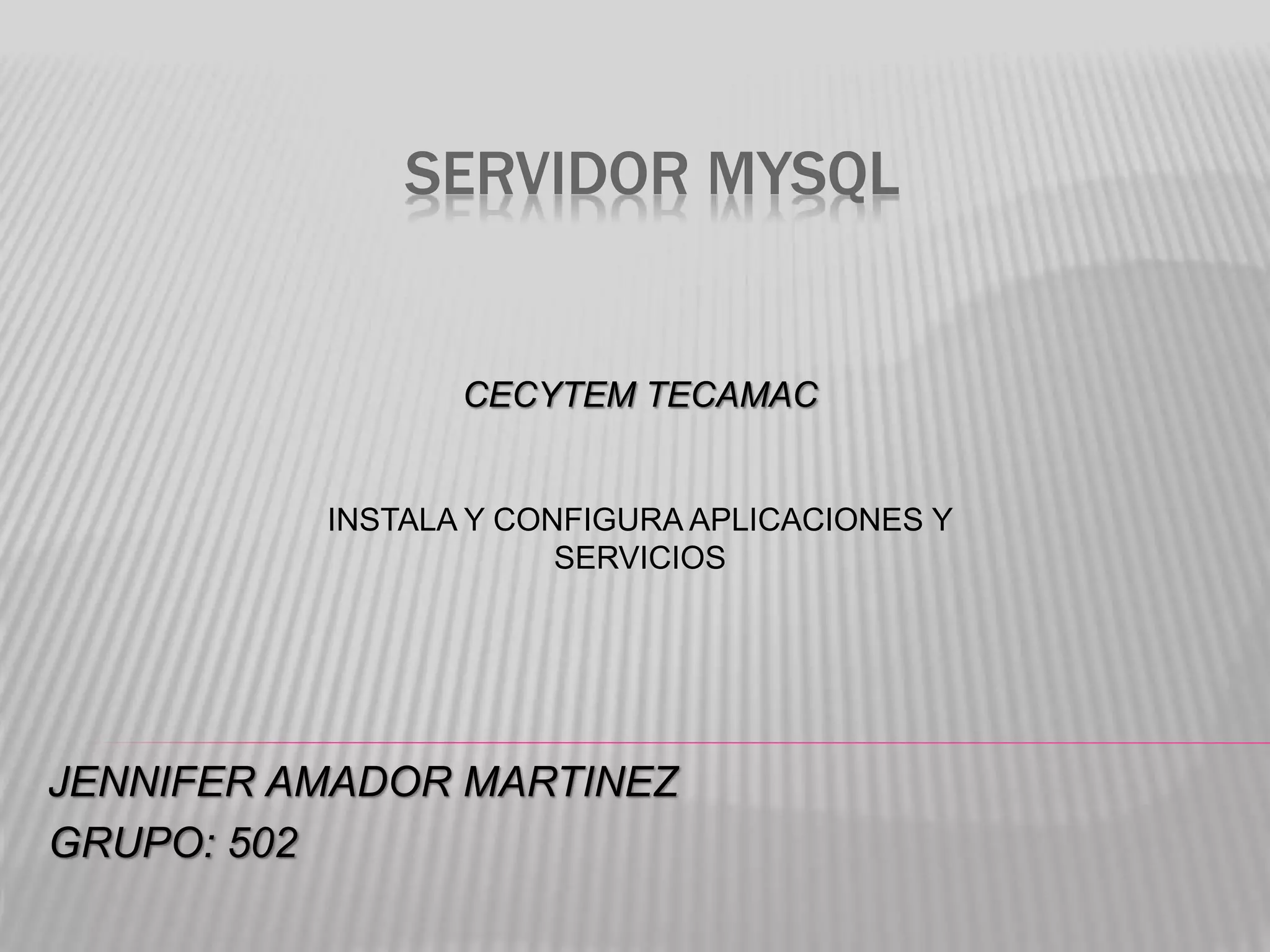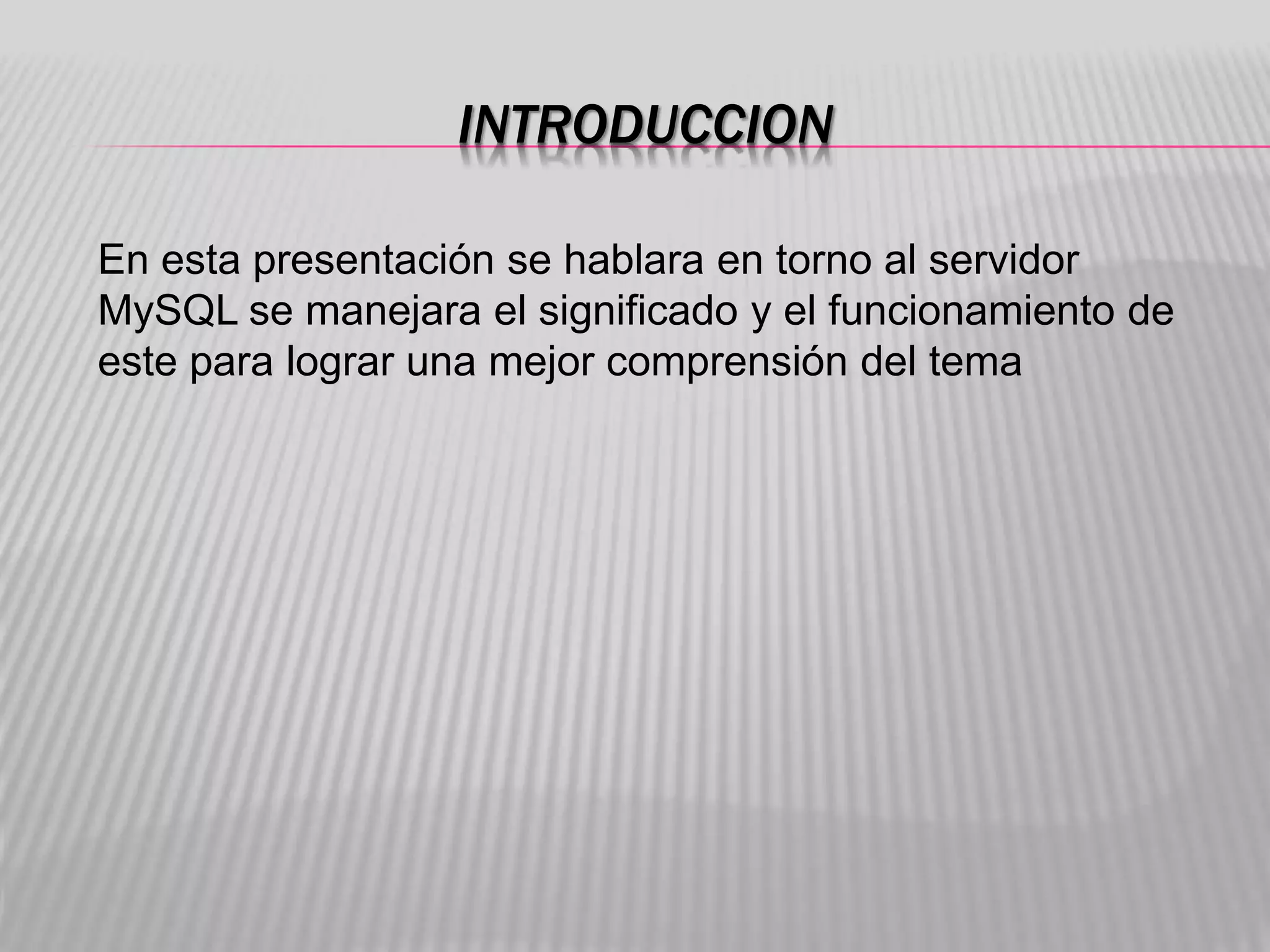 MySQL es un sistema de gestión de bases de datos relacional de código abierto creado por MySQL AB. Originalmente carecía de características como integridad referencial y transacciones, pero atrajo a desarrolladores web debido a su simplicidad. MySQL usa la licencia GPL, lo que significa que cualquiera puede usar, modificar y estudiar su código libremente.
