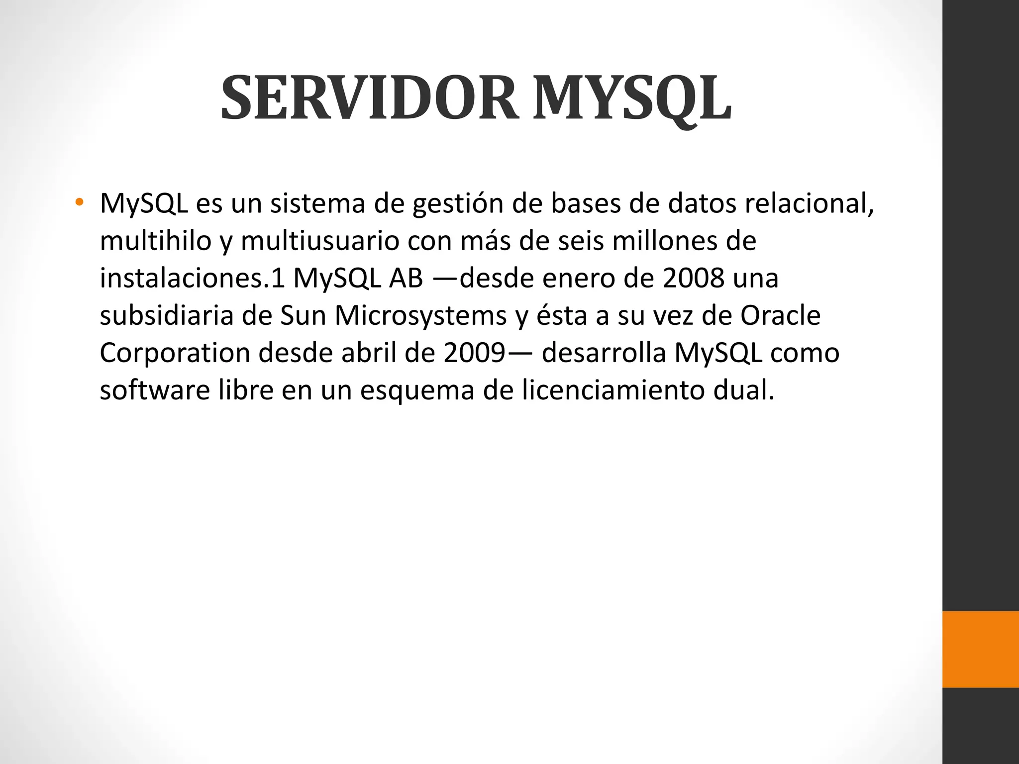 MySQL es un sistema de gestión de bases de datos relacional desarrollado principalmente en ANSI C. Es software libre bajo la licencia GPL pero también ofrece licencias privativas. Es patrocinado y desarrollado por una empresa privada que posee los derechos de autor y ofrece soporte y servicios además de la venta de licencias.