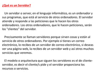 Un servidor es un ordenador que proporciona recursos y servicios a otros ordenadores (clientes) a través de una red. Los servidores almacenan y distribuyen datos e información, como correo electrónico, páginas web y más. Funcionan las 24 horas para garantizar la disponibilidad continua de los servicios a los clientes de la red. Los principales tipos de servidores incluyen servidores de correo, web, impresión y almacenamiento.