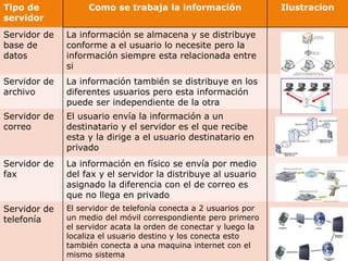 El documento describe los diferentes tipos de servidores y cómo manejan la información. Incluye servidores de base de datos, archivo, correo, fax, telefonía, proxy, uso, web y de reserva/seguridad. Cada servidor almacena, distribuye y facilita el acceso a la información de manera diferente y según las necesidades y características de los usuarios.