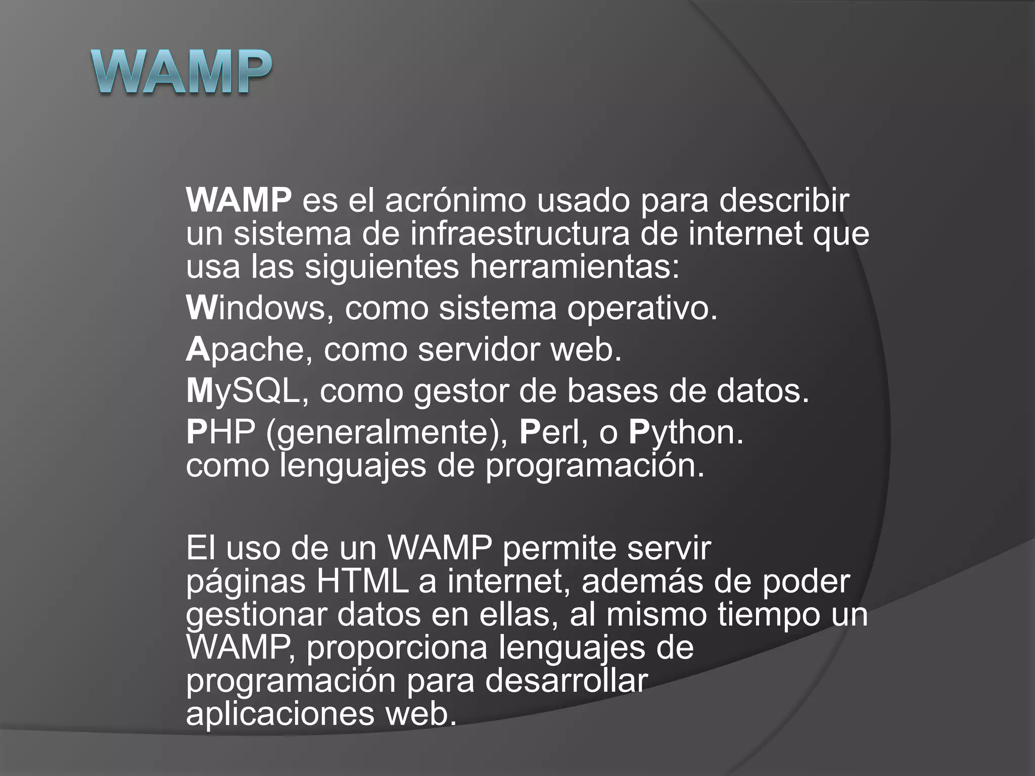 WAMP es un sistema de infraestructura de internet que usa Windows como sistema operativo, Apache como servidor web, MySQL como gestor de bases de datos y PHP, Perl o Python como lenguajes de programación. XAMPP es un servidor independiente de plataforma que consiste en MySQL, Apache, y los intérpretes PHP y Perl. Funciona como un servidor web libre y fácil de usar en sistemas operativos como Windows, Linux, Solaris y MacOS. MAMPP se refiere al sistema creado por la conjunción de aplicaciones libres como Apache, MySQL y PHP/Python/