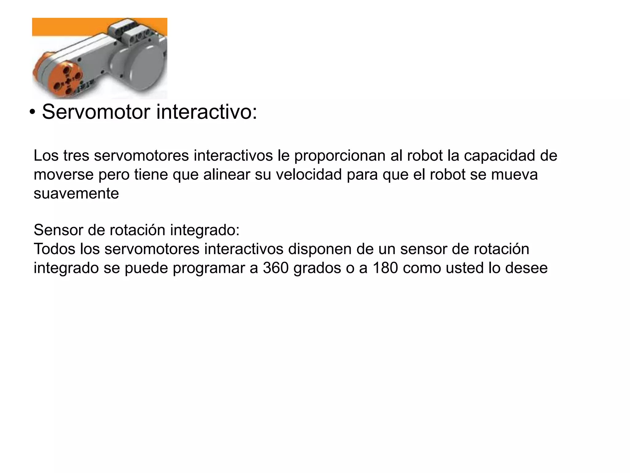 Los tres servomotores interactivos le permiten al robot moverse pero deben alinear su velocidad para un movimiento suave. Cada servomotor incluye un sensor de rotación integrado que puede programarse de 360 a 180 grados. Las lámparas pueden encenderse y apagarse en patrones para indicar el estado de un sensor o motor y también pueden usarse con un sensor fotosensible.