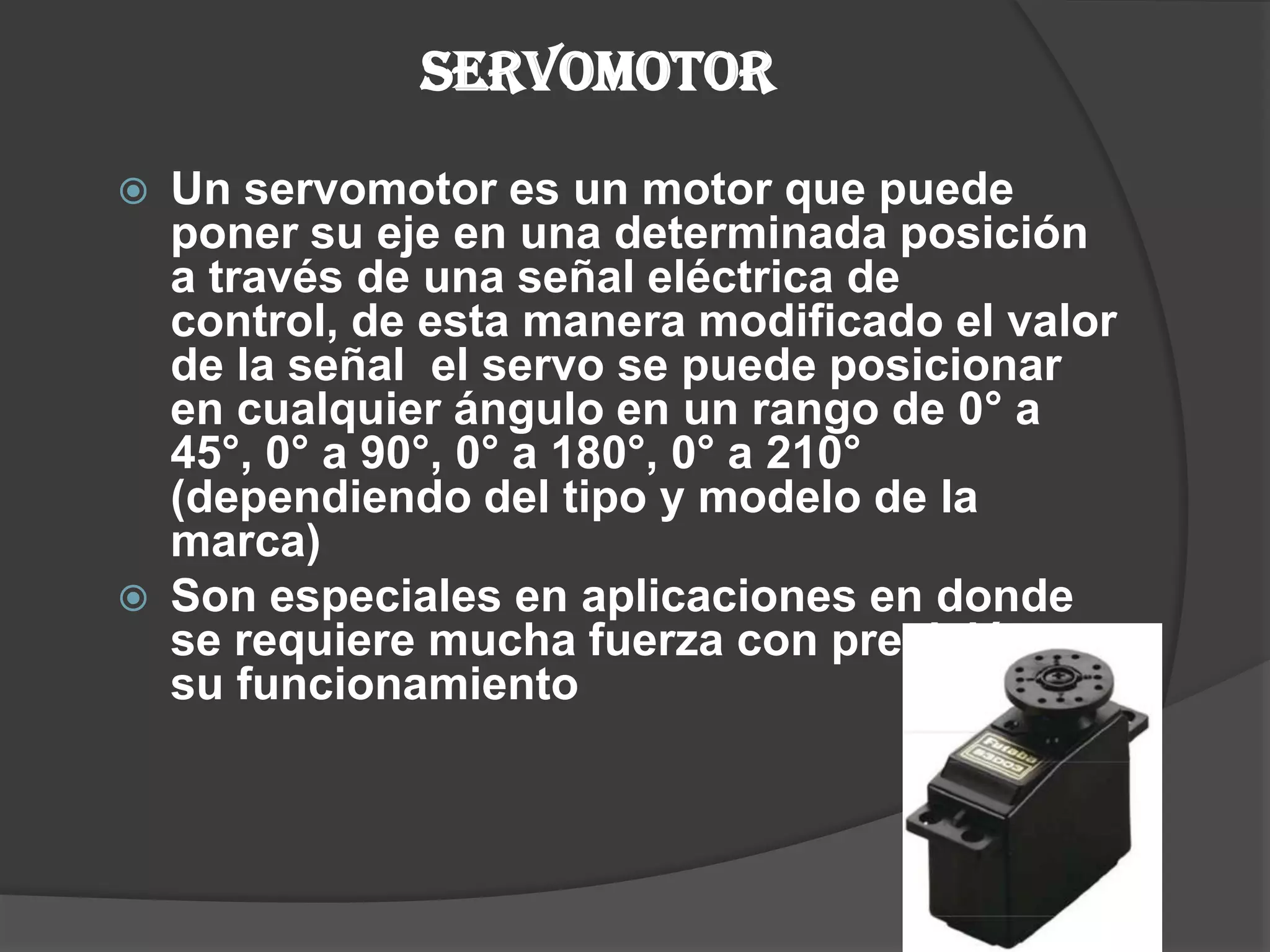 Un servomotor es un motor que puede posicionar su eje en ángulos específicos determinados por una señal eléctrica de control, entre 0° y 180°. Contiene un motor de CC, engranajes reductores y un circuito de control que recibe pulsos para determinar la posición. La posición angular se controla variando la duración de los pulsos de una señal PWM entre 1 ms y 2 ms, donde 1.5 ms corresponde a 90°. Los servomotores se usan comúnmente en aplicaciones que requieren precisión de movimiento, como control remoto y robots.