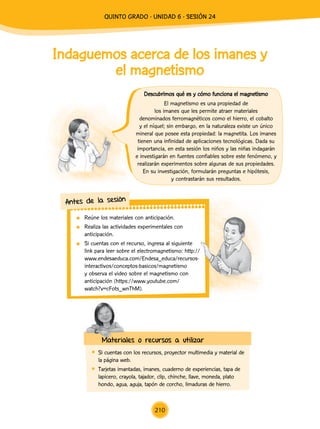 Este documento presenta una sesión de clase sobre magnetismo para estudiantes de quinto grado. La sesión comienza con una introducción al tema usando tarjetas imantadas. Luego, los estudiantes formulan preguntas e hipótesis sobre qué materiales pueden ser atraídos por un imán. Trabajando en grupos, realizan experimentos para probar sus hipótesis y analizan los resultados. Al final, elaboran conclusiones sobre las propiedades magnéticas de los imanes.