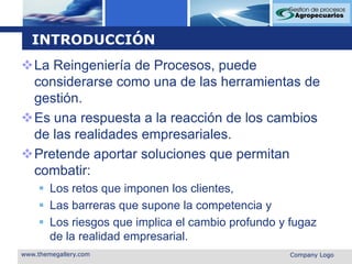 La reingeniería de procesos busca realizar cambios radicales en los procesos de una organización para lograr mejoras dramáticas en medidas como costos, calidad y servicio. Involucra identificar procesos clave, evaluarlos, rediseñarlos centrándose en satisfacer al cliente, y ejecutar los cambios de manera efectiva.