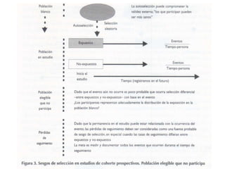 El documento describe diferentes tipos de sesgos que pueden afectar la validez de los estudios de cohorte, incluyendo sesgos de selección, información y confusión. Explica que los estudios de cohorte son menos propensos al sesgo sistemático que otros diseños observacionales, pero deben considerarse cuidadosamente las pérdidas en el seguimiento de pacientes, cómo se obtiene la información sobre la exposición y cómo se determina la ocurrencia de la enfermedad. También cubre la importancia de identificar y controlar factores