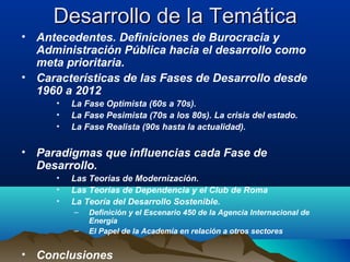 Este documento presenta una sesión sobre la burocracia y administración pública a la luz del desarrollo en Guatemala entre 1960-2010. Se dividen los 50 años en tres fases: la fase optimista de los 1960-1970, la fase pesimista de los 1970-1980 marcada por crisis, y la fase realista desde los 1990 hasta la actualidad. También se discuten los paradigmas e ideas que influenciaron cada fase, como las teorías de modernización, dependencia, y desarrollo sostenible. Finalmente, se presentan conclusiones sobre los des
