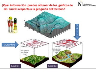 El documento presenta información sobre funciones de varias variables en el contexto de cálculo 3. Explica cómo las curvas de nivel en gráficos topográficos pueden proporcionar información sobre la geografía del terreno. Luego define funciones de dos variables, sus dominios y rangos, y presenta ejemplos para ilustrar conceptos como álgebra y gráficas de funciones de varias variables. Finalmente, introduce curvas de nivel y cómo calcular el dominio de una función.