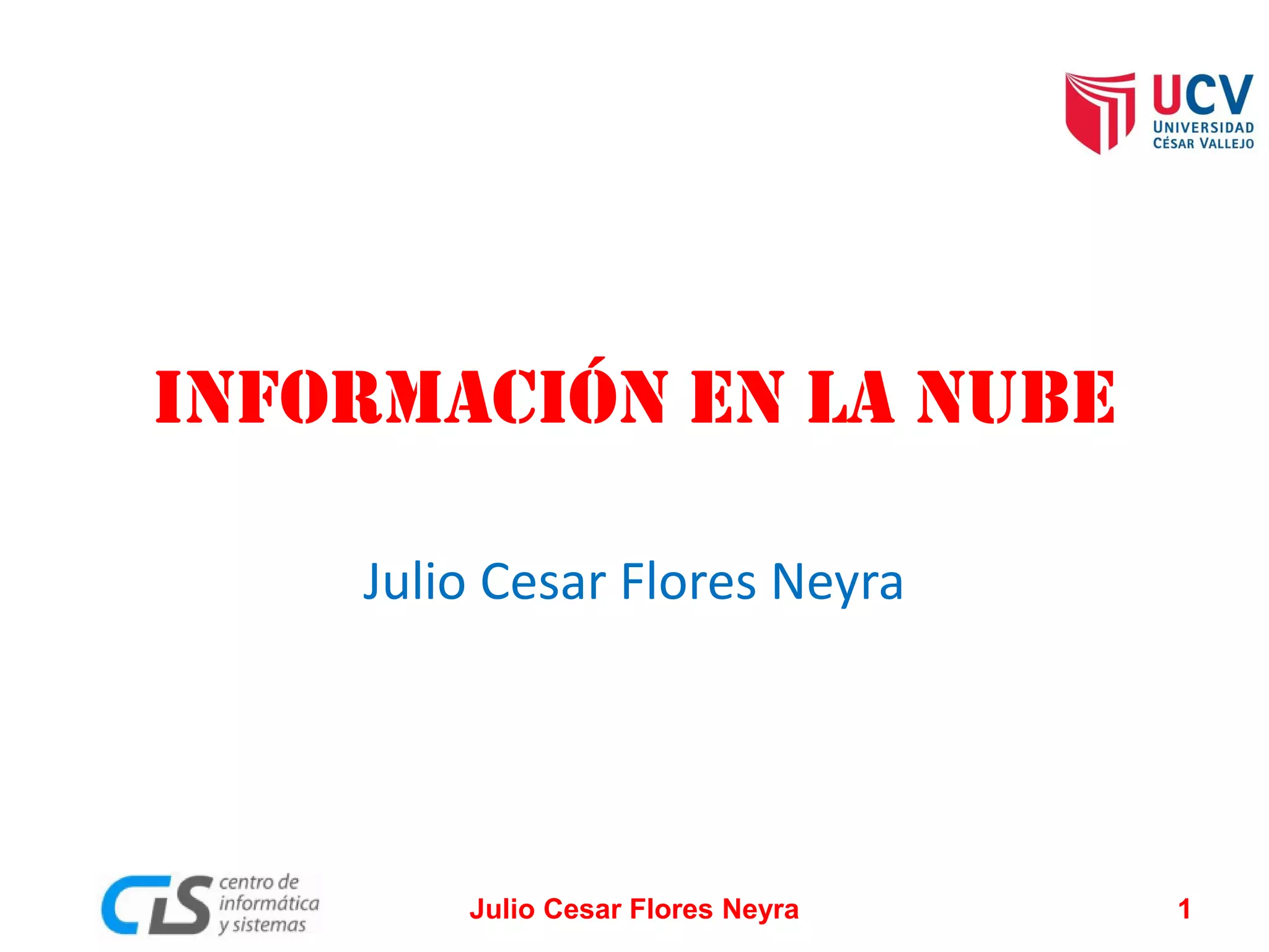 Este documento describe varios servicios de información en la nube. Explica que la computación en la nube permite almacenar y acceder datos y recursos a través de Internet en lugar de en la computadora local. Describe los servicios Google Drive para almacenar documentos en línea y SlideShare para compartir presentaciones. También habla sobre cómo crear y publicar un blog usando la plataforma Blogger de Google.