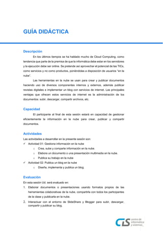 Este documento describe cómo gestionar información en la nube utilizando herramientas como Google Drive y SlideShare, y diseñar e implementar un blog. Explica cómo crear y compartir documentos en Google Drive y publicar presentaciones en SlideShare. También proporciona instrucciones paso a paso para diseñar e implementar un blog utilizando Blogger.