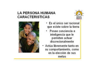 Este documento presenta una sesión sobre la dignidad de la persona humana según la enseñanza de Jesús. Jesús es el modelo perfecto de persona que trató a todos por igual y luchó contra la desigualdad. La fe cristiana fundamenta la dignidad en que todas las personas son hijos de Dios. Los cristianos deben tratar a los demás con respeto e igualdad como Jesús enseñó.