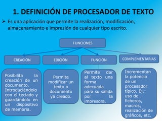 Este documento proporciona una introducción a Microsoft Word. Define un procesador de texto como una aplicación que permite la creación, edición, almacenamiento e impresión de documentos. Luego describe las funciones básicas de Word, incluida la creación, edición y funciones complementarias de documentos. Finalmente, explica cómo iniciar Word y identifica las principales partes de la interfaz de usuario como la cinta de opciones, las barras de herramientas y las vistas.