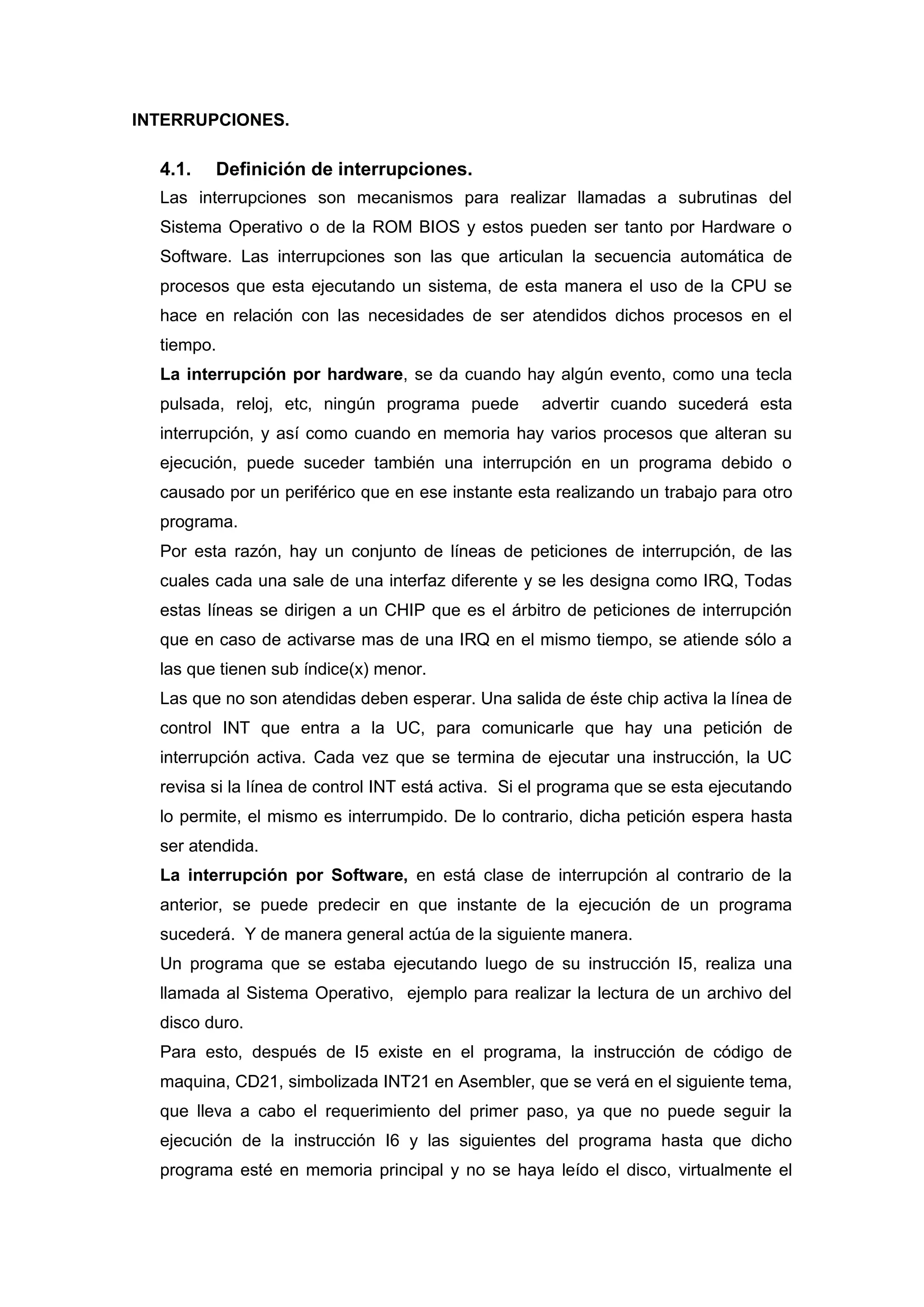 El documento describe las interrupciones en sistemas computacionales. Define las interrupciones por hardware y software, e indica que permiten mejorar la eficiencia al permitir que la CPU ejecute otras tareas mientras una operación de entrada/salida está en proceso. Explica que cuando ocurre una interrupción, la CPU suspende la ejecución del programa actual para ejecutar una rutina de manejo de interrupciones, luego reanuda la ejecución del programa original.
