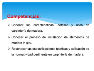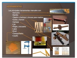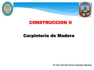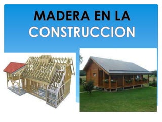 Este documento describe los procesos de obtención y tratamiento de la madera, sus características físicas y químicas, clasificaciones, usos comunes en construcción y normativas. Explica el proceso de tala de árboles, descortezado, aserrado, secado y almacenamiento de la madera. También cubre las propiedades de la madera como densidad, color, textura y durabilidad, así como su comportamiento ante factores como la humedad y la temperatura.