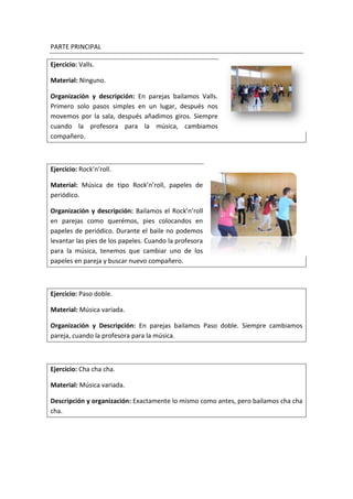 La sesión consistió en una serie de ejercicios de calentamiento y bailes como el Vals, el Rock'n'roll, el Paso Doble y el Cha Cha Cha. Los ejercicios de calentamiento incluyeron el uso de aros y guiar a un compañero con los ojos cerrados. La reflexión final discutió cómo enseñar la batuka, sugiriendo un enfoque de mando directo pero también dar a los estudiantes libertad para crear sus propios pasos.