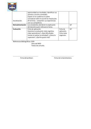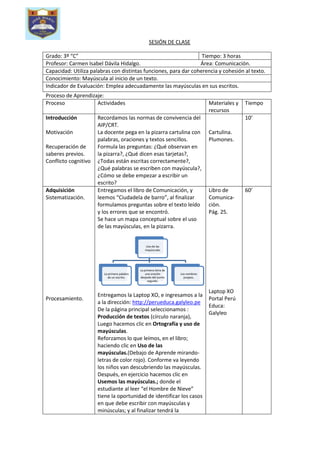 El documento presenta un plan de clase de 3 horas para estudiantes de 3er grado sobre el uso adecuado de mayúsculas. La clase comienza con una discusión sobre las normas de ortografía, luego los estudiantes leen un texto e identifican errores de mayúsculas. Más tarde, usan recursos digitales para reforzar el tema y completan ejercicios de práctica. Al final, evalúan su comprensión y discuten lo aprendido.