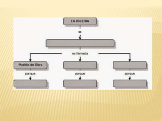La sesión presenta información sobre la Iglesia como el Nuevo Pueblo de Dios. Explica que la Iglesia está formada por miembros laicos, sacerdotes y religiosos, cada uno con una misión específica. El Papa, como obispo de Roma, es el signo visible de unidad de la Iglesia. Los estudiantes ven un video y completan actividades para comprender mejor las características y funciones de la Iglesia y sus miembros.
