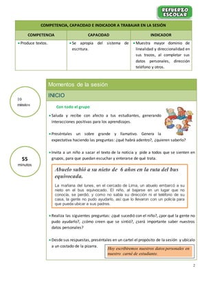Este documento describe una sesión de segundo grado en la que los estudiantes completarán sus datos personales en sus carnés de estudiante. La sesión se divide en inicio, desarrollo y cierre. En el desarrollo, los estudiantes planificarán los datos a incluir y luego escribirán dichos datos de forma individual, recibiendo apoyo del maestro. Finalmente, revisarán y trasladarán los datos a un carné final.