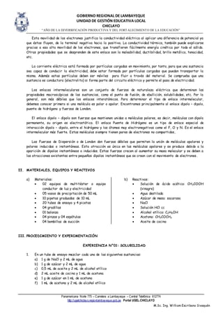 1) El documento describe experimentos sobre los tipos de enlaces químicos y físicos y su influencia en las propiedades de las sustancias como la solubilidad y la conductividad eléctrica.
