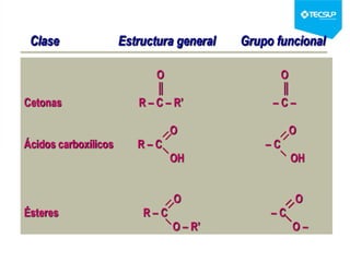 Este documento presenta una sesión de química orgánica sobre grupos funcionales e isómeros. Explica los principales grupos funcionales y sus nombres, tipos de isomería como isomería de cadena e isomería geométrica, y conceptos como efectos inductivos y mesómeros. También cubre temas como reactividad química, tipos de reacciones como sustitución y adición, y ruptura de enlaces. El objetivo es identificar los tipos de fórmulas de hidrocarburos.