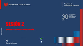 Este documento presenta información sobre una sesión de capacitación sobre variables e instrumentos de investigación. Explica conceptos clave como variables, su clasificación y operacionalización, así como técnicas e instrumentos de recolección de datos. El objetivo es que los participantes elaboren un primer avance de un informe estadístico que incluya la introducción, variables y su operacionalización.