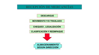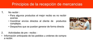 1) El documento describe los principios y procesos de recepción de mercancías en un almacén, incluyendo el descargue, chequeo, clasificación, almacenamiento y direccionamiento de los productos.