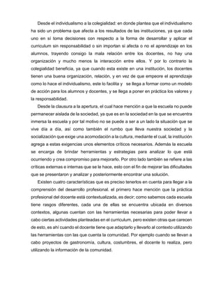 Este documento resume los diferentes conceptos relacionados con la organización escolar y el desarrollo profesional docente. Explica que la práctica docente debe adaptarse al contexto, está llena de conflictos de valores, es cambiante y está regulada por normas. También describe al currículo como una plataforma para la experimentación, reflexión e intercambio intelectual entre docentes, mejorando su formación a través del análisis colectivo de la práctica.