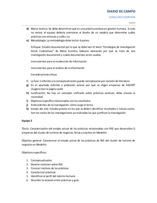 Este documento presenta las observaciones realizadas por un experto a tres proyectos de investigación propuestos por equipos del semillero de investigación COMPHOR de la Universidad de Antioquia. Para cada proyecto, el experto comenta aspectos como el título, los objetivos, la metodología, el marco teórico y la justificación, haciendo sugerencias para mejorar la formulación y el diseño metodológico de cada uno.