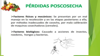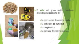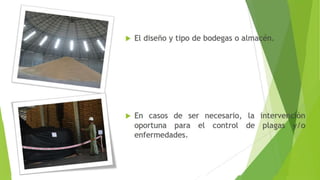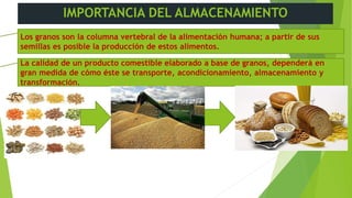 Este documento trata sobre la importancia del almacenamiento de productos agrícolas. Explica que la calidad de los alimentos elaborados a base de granos depende de cómo se transportan, almacenan y transforman los granos. También describe los objetivos del almacenamiento, que son preservar la integridad del grano y estandarizarlo para darle un valor comercial, logrado mediante el almacenamiento en condiciones frescas, secas y sanas.
