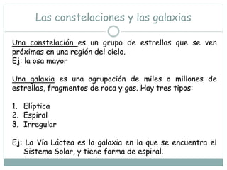 Las estrellas son enormes esferas de gas que producen grandes cantidades de energía en forma de luz y calor. El Sol es la estrella más cercana a la Tierra. Las estrellas varían en color, tamaño, luminosidad y brillo. Las constelaciones son grupos de estrellas que parecen cercanas en el cielo, mientras que las galaxias son agrupaciones masivas de estrellas, rocas y gas que pueden ser elípticas, espirales o irregulares, como nuestra Vía Láctea la cual tiene forma esp