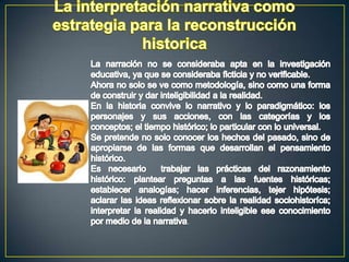 El documento discute el uso de la narrativa como estrategia para la reconstrucción histórica. Señala que la narrativa ya no solo se ve como una metodología, sino como una forma de dar inteligibilidad a la realidad. También destaca la importancia de trabajar prácticas como plantear preguntas a las fuentes históricas y establecer hipótesis para comprender la historia.