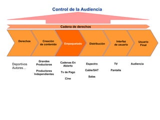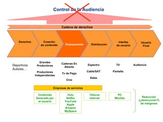 El documento habla sobre la evolución de la industria de los medios de comunicación hacia modelos híbridos y transmedia que permiten una mayor interactividad del usuario y nuevas fuentes de ingresos. Menciona tendencias como la televisión híbrida, el contenido generado por el usuario, las franquicias multimedia y la narrativa transmedia. También analiza temas como los derechos de autor, la distribución de contenidos y el papel creciente del público en la cultura convergente.