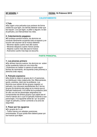 Este documento describe una sesión de educación física que incluye varios ejercicios de calentamiento y la parte principal. En la parte de calentamiento, los estudiantes participan en juegos como "tula" y un calentamiento con música. La parte principal incluye ejercicios como ordenarse por fecha de nacimiento, un juego con pañuelos imitando personajes, transportar compañeros simulando objetos, y crear carrozas con materiales. El documento también incluye una reflexión de un estudiante y detalles sobre el rol del