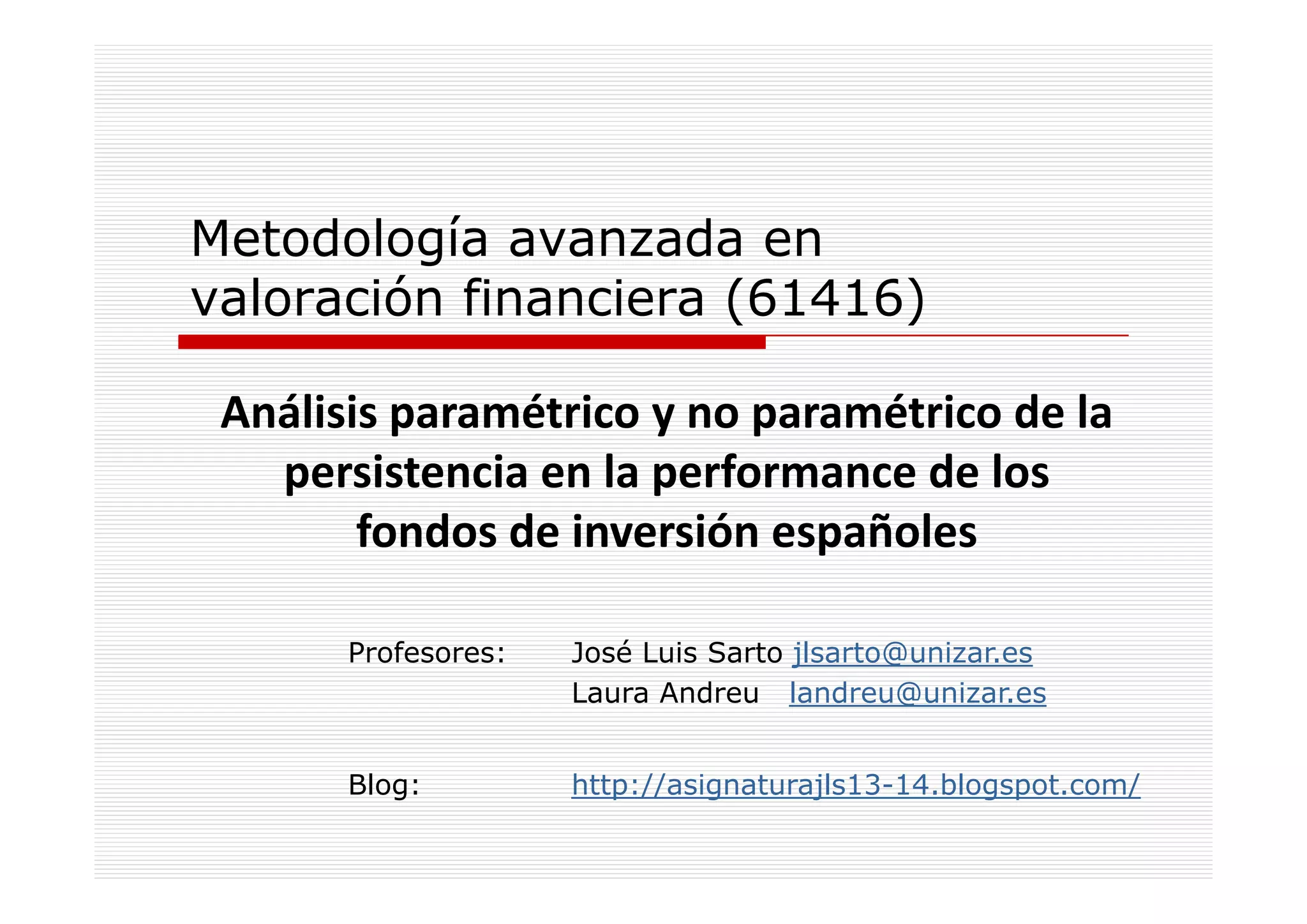 Este documento resume un estudio que analiza la persistencia en el rendimiento de 207 fondos de inversión españoles entre 1994 y 2002 utilizando análisis paramétricos y no paramétricos. Los resultados muestran evidencia de persistencia en la performance a través de tablas de contingencia, regresiones y pruebas estadísticas. Considerar períodos más amplios de datos históricos no mejora necesariamente la predicción de la performance futura. La observación de la performance pasada puede ayudar a los inversores y gestores a tomar mejores decision