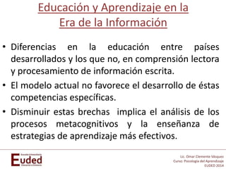 El documento describe el proceso metacognitivo en la enseñanza y el aprendizaje. Explica que la metacognición implica el conocimiento y regulación de los propios procesos cognitivos, como la planificación, monitoreo y evaluación del aprendizaje. También señala que desarrollar habilidades metacognitivas puede ayudar a disminuir las brechas en la comprensión lectora y el procesamiento de la información entre países desarrollados y en desarrollo.