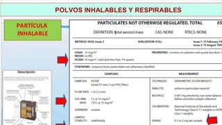 Este documento trata sobre los factores químicos de seguridad industrial. Explica las diferentes formas en que los agentes químicos pueden entrar en contacto con el cuerpo humano y clasifica los contaminantes químicos según su estado físico, composición química y efectos fisiológicos. También define términos como partes por millón y proporciona ejemplos de equipos de protección como bombas gravimétricas y filtros.