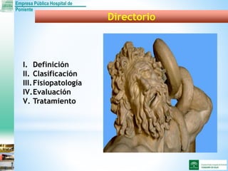 El documento define el dolor y lo clasifica en agudo y crónico. Explica la fisiopatología del dolor a través de los receptores, vías aferentes, estructuras cerebrales y vías descendentes. Describe la evaluación del dolor mediante la historia clínica, escalas unidimensionales y multidimensionales, y escalas funcionales y de dolor neuropático. Finalmente, detalla el tratamiento farmacológico empleando fármacos de primer, segundo y tercer escalón, así como fármacos coadyuvantes.