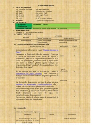La sesión de aprendizaje se llevó a cabo el 16 de noviembre de 2010 en la Institución Educativa José María Arguedas para estudiantes de 2do sección A y B del área de Educación para el trabajo. La sesión, dirigida por la docente María López Roque, tuvo como objetivo que los estudiantes reconozcan los tipos de tejido artesanal y su importancia a través de diversas actividades como ver un video, leer información y completar un cuadro de doble entrada sobre los tipos de tejido.