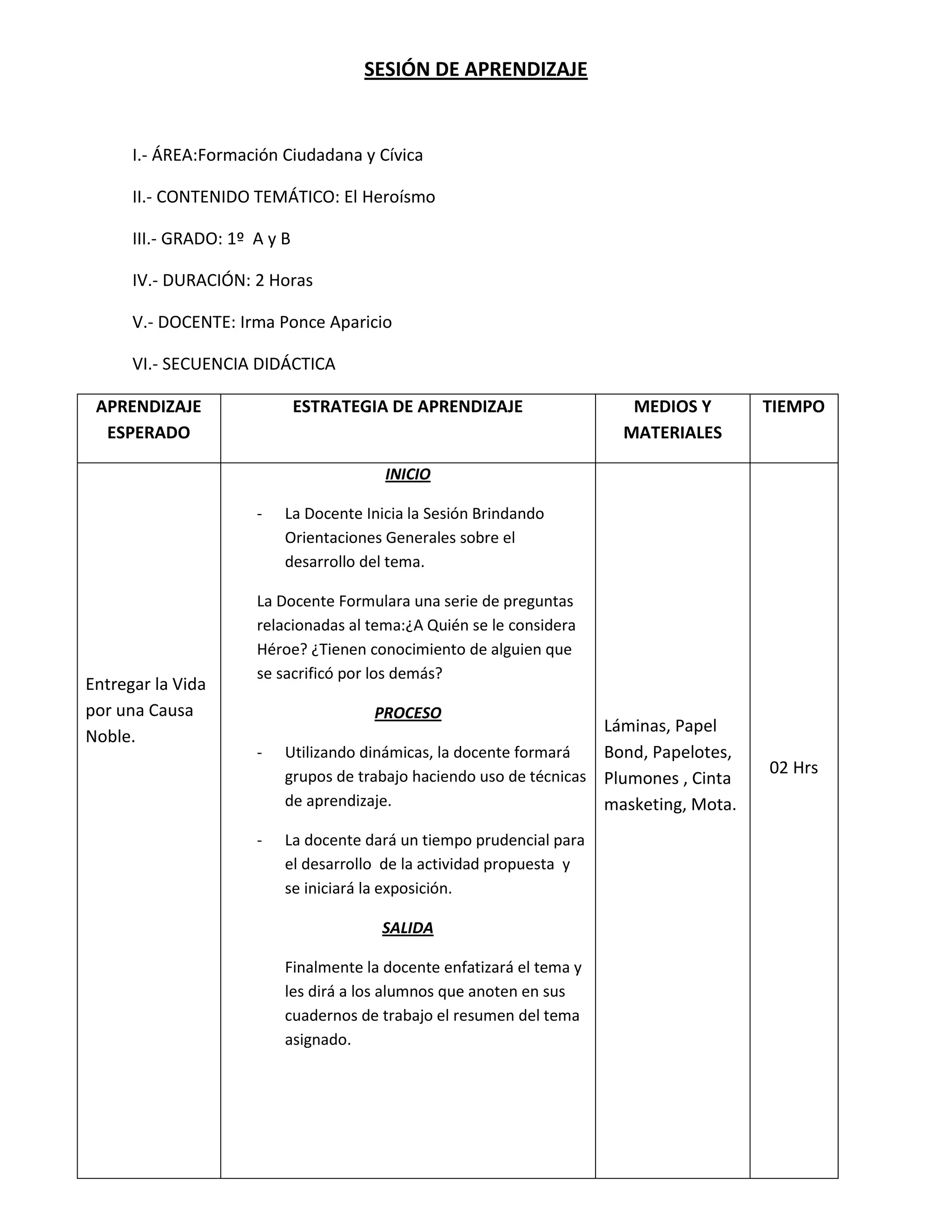 La sesión de aprendizaje trata sobre temas de formación ciudadana y cívica para diferentes grados. La docente Irma Ponce Aparicio utiliza dinámicas de grupo y técnicas de aprendizaje para enseñar sobre el heroísmo, Francisco Bolognesi y la paz, evaluando el logro de los objetivos a través de exposiciones y guías de observación.