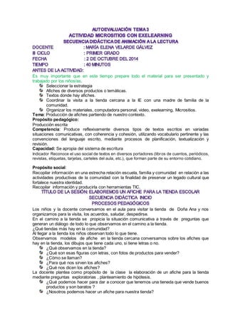 El documento describe un plan de lecciones para enseñar a los estudiantes a crear afiches publicitarios. Los estudiantes visitarán una tienda local, observarán los afiches existentes y discutirán su propósito y elementos. Luego, en grupos, los estudiantes planificarán y crearán sus propios afiches publicitarios para la tienda, escribiendo textos, seleccionando imágenes y pegando los afiches terminados en la escuela. Al final, reflexionarán sobre lo que aprendieron en la actividad.