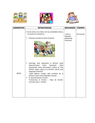 Este documento presenta una sesión de aprendizaje sobre la familia dirigida a estudiantes de tercer grado. La sesión incluye información sobre la escuela, maestros, fecha y objetivos. Se utilizan estrategias como lectura, discusión en grupo y actividades prácticas para que los estudiantes aprendan sobre los tipos y funciones de la familia. La sesión concluye con una evaluación y tarea sobre cómo les gustaría que fuera su propia familia.
