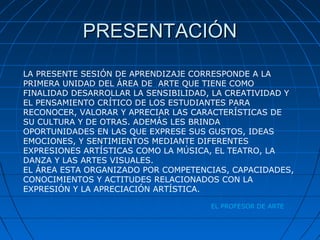 Los estudiantes aprenden sobre el color y sus combinaciones a través de una sesión de aprendizaje de arte de 2 horas. Primero se motiva a los estudiantes con una canción y lluvia de ideas sobre colores regionales. Luego, trabajan en grupos para dibujar y pintar con témperas usando solo colores primarios y descubrir cómo mezclarlos para obtener otros colores. Finalmente, comparten y evalúan sus creaciones, descubriendo cómo se obtuvieron diferentes colores a través de las combinaciones.