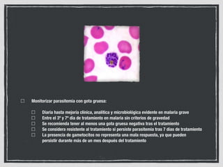 Este documento resume las características de la malaria causada por diferentes especies de Plasmodium, así como su fisiopatogenia, manifestaciones clínicas, diagnóstico y tratamiento. La malaria es una enfermedad transmitida por la picadura de mosquitos del género Anopheles infectados con Plasmodium. Existen cinco especies que infectan al ser humano, siendo P. falciparum la más virulenta y la causante de la mayoría de los casos graves y muertes. El diagnóstico se realiza mediante frotis sanguíneo