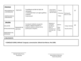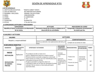 Este documento presenta la sesión de aprendizaje número 01 sobre el subrayado. La sesión se llevará a cabo en la Institución Educativa "Benito Juárez" N°0073 y será dictada por la jefa de práctica María Beltrán Mechato. La sesión durará 90 minutos y abordará las capacidades, valores, estrategias didácticas e instrumentos de evaluación relacionados con el tema del subrayado.