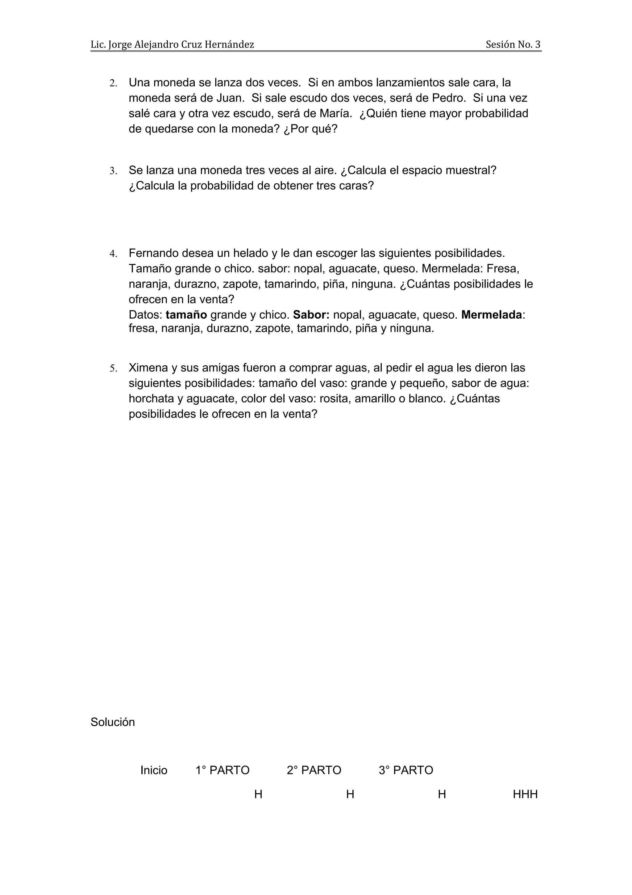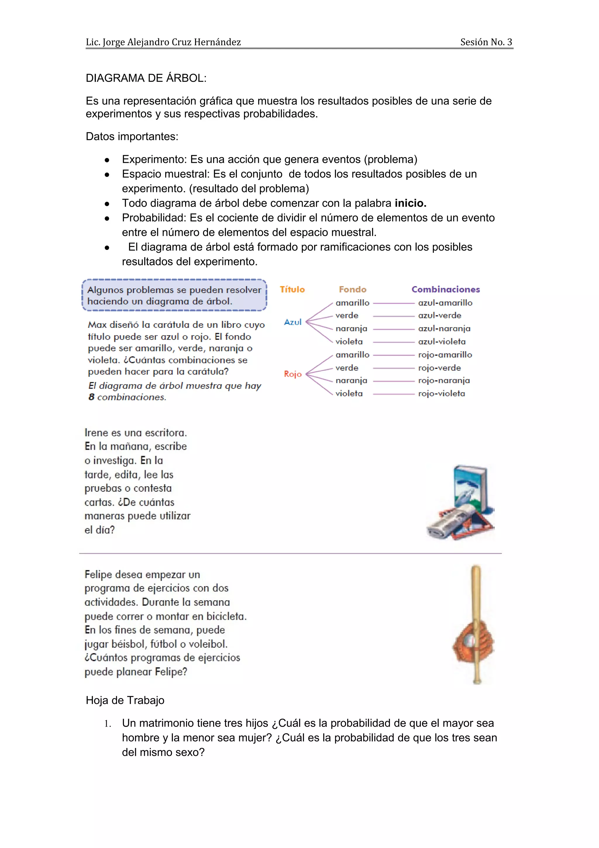El documento describe el diagrama de árbol, que muestra los resultados posibles de una serie de experimentos y sus probabilidades. Explica que un diagrama de árbol comienza con la palabra "inicio" y contiene ramificaciones con los resultados posibles. Luego, presenta 5 problemas de probabilidad para resolver usando diagramas de árbol.